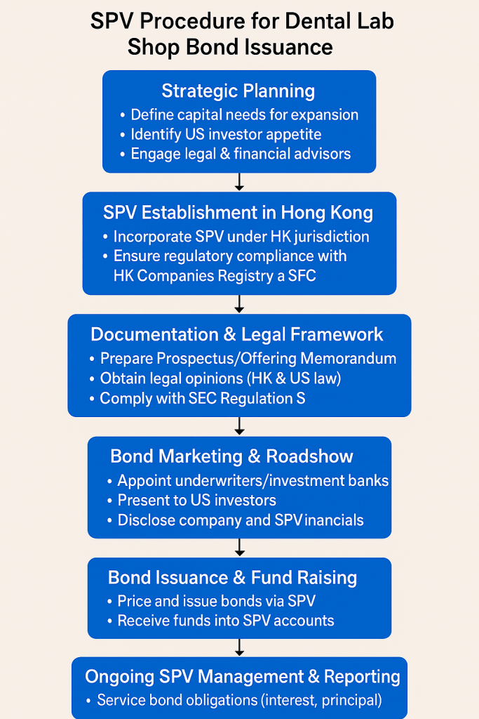 Issuing bonds through an SPV allows “Dental Lab Shop” to leverage Hong Kong’s favorable conditions for financial activities. The process involves careful planning, including selecting underwriters, preparing necessary documentation, and complying with both local and international regulations. Once the SPV is set up and approved, it can proceed with issuing bonds targeted at US investors.